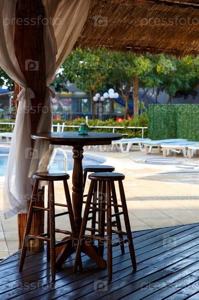 Никто не сидит за деревянным табуретом в ресторане под открытым небом в полдень у бассейна