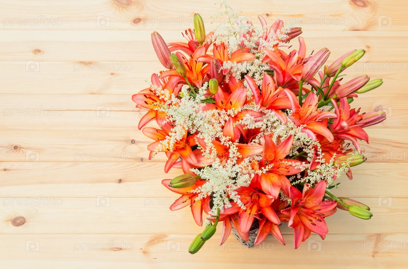 Букет из оранжевых лилий и белых цветов астильбы. Вид сверху, пространство для копирования