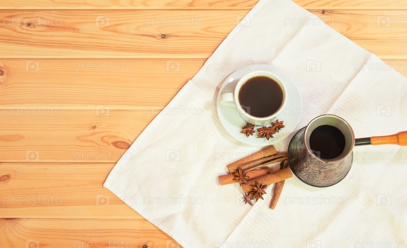 Чашка кофе, турка и специи на деревянном столе. Вид сверху