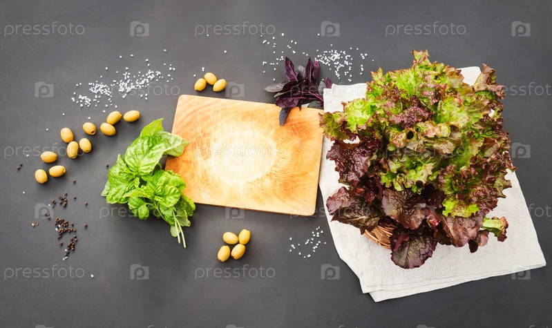 Листья салата, разделочная доска, зеленые оливки, специи и базилик. Вид сверху, пространство для копирования