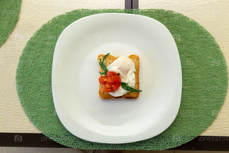 Поджаренный хлеб из цельного зерна с яйцом-пашот, помидорами, рукколой и сыром на белой тарелке