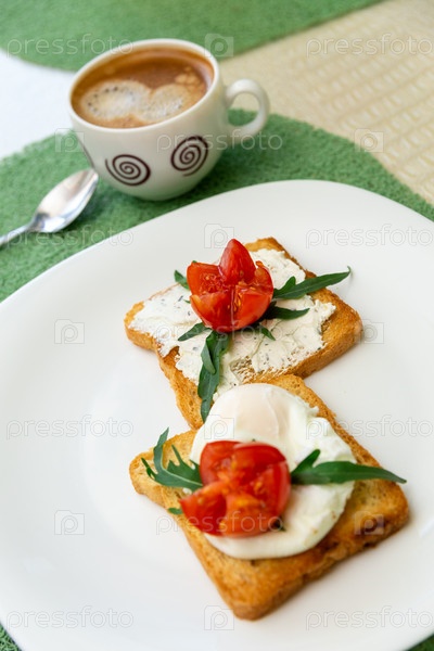 Завтрак с чашкой кофе и поджаренным хлебом из цельной пшеницы с яйцом-пашот, помидорами, рукколой и сыром на белой тарелке