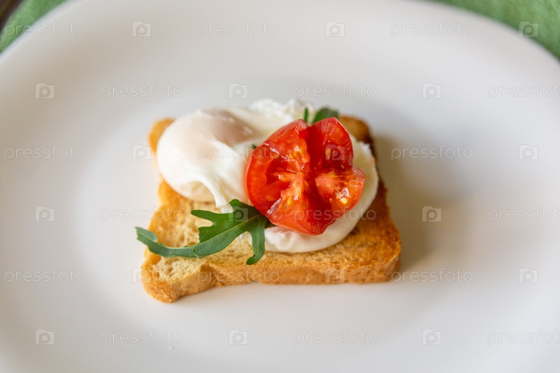 Поджаренный хлеб из цельного зерна с яйцом-пашот, помидорами, рукколой и сыром на белой тарелке