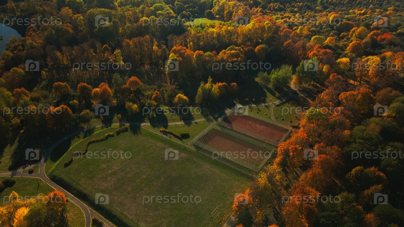 Осенний городской парк. Деревья с разноцветными листьями. Спортивные площадки. Осенний пейзаж. Аэрофотосъемка. Полет с медленной камерой вниз