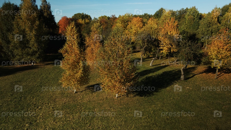 Осенний городской парк. Деревья с разноцветными листьями. Осенний пейзаж. Аэрофотосъемка