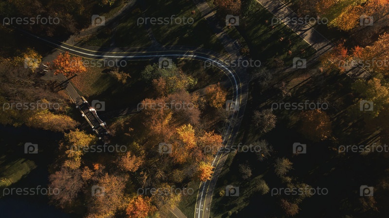 Осенний городской парк. Деревья с разноцветными листьями. Между деревьями видна извилистая велосипедная дорожка. Осенний пейзаж. Аэрофотосъемка