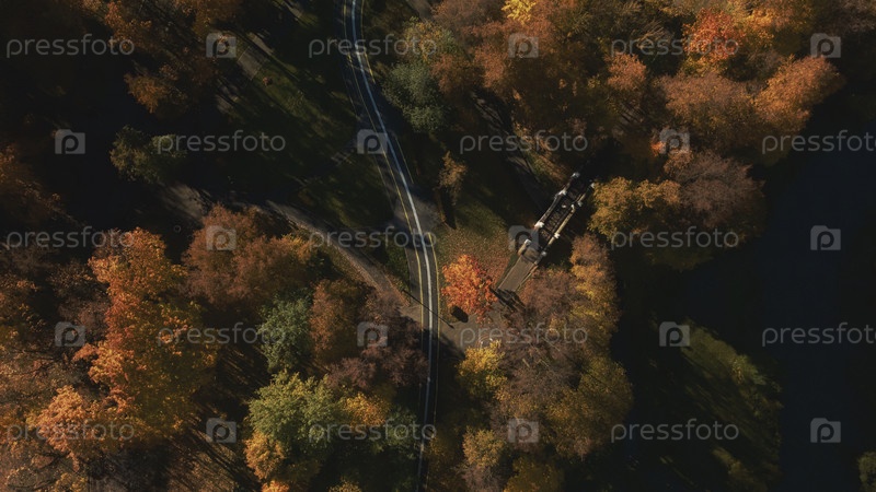 Осенний городской парк. Деревья с разноцветными листьями. Между деревьями видна извилистая велосипедная дорожка. Осенний пейзаж. Аэрофотосъемка