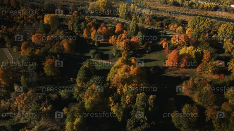 Осенний городской парк. Деревья с разноцветными листьями. Осенний пейзаж. Аэрофотосъемка