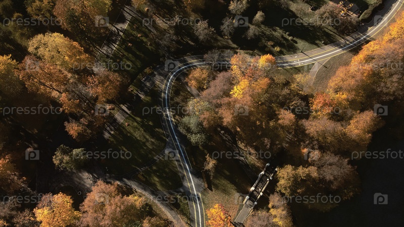 Осенний городской парк. Деревья с разноцветными листьями. Между деревьями видна извилистая велосипедная дорожка. Осенний пейзаж. Аэрофотосъемка