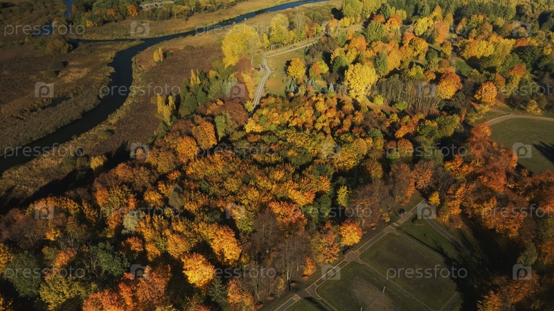 Осенний городской парк. Деревья с разноцветными листьями. Спортивные площадки. Осенний пейзаж. Аэрофотосъемка. Полет с медленной камерой вниз