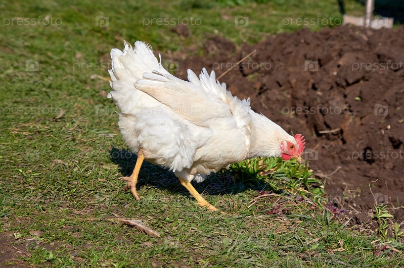 Белая курица идет по траве и ищет еду