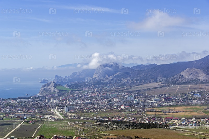 Вершины гор, накрытые облаками. Вид со склона горы Ай-Георгий (западная оконечность хребта Токлук-Сырт). Крым, весна, начало апреля