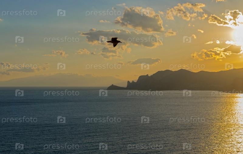 Чайка на фоне закатного неба. Окрестности курортного города Судак, Крым. Вид с мыса Алчак в сторону Нового Света