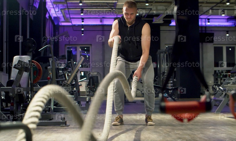 Мужчина-бодибилдер делает упражнения, используя боевые канаты в спортзале. Концепция фитнеса, спорта, упражнений, тренировок и образа жизни