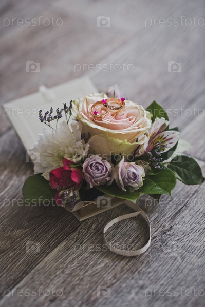 Стильная бутоньерка на столе в ожидании использования