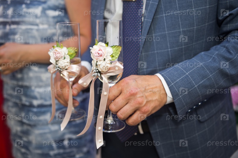 Украшенные тканью и цветами бокалы для шампанского
