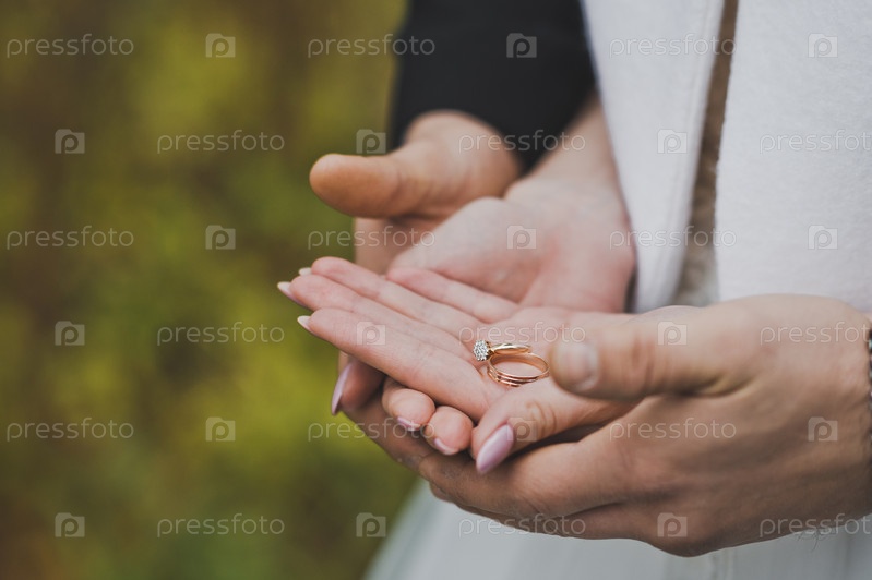 Обручальные кольца в руках молодоженов