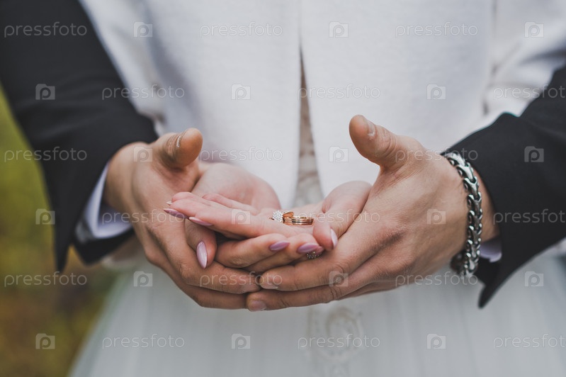 Обручальные кольца в руках молодоженов