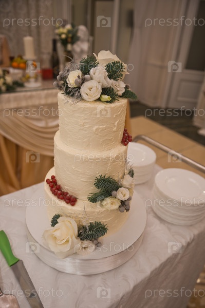 Белый трехъярусный торт стоит на свадебном столе