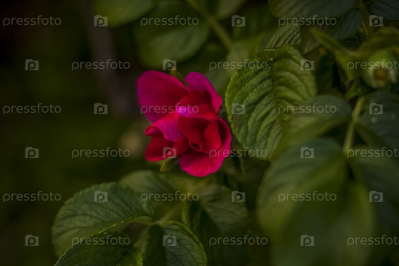 Кустарник с цветками розовой розы. Крупный план с копией пространства на фоне природного ландшафта. Натуральные обои. Выборочный фокус