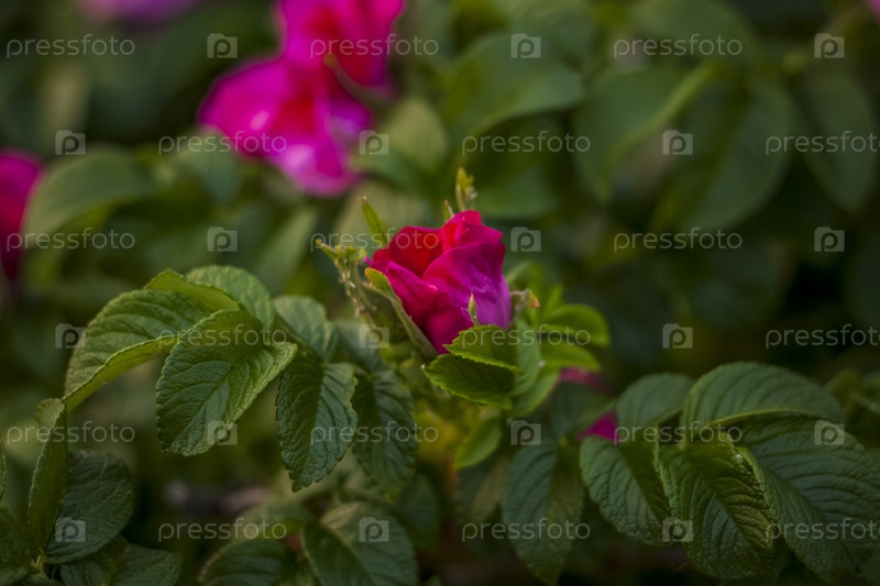 Кустарник с цветками розовой розы. Крупный план с копией пространства на фоне природного ландшафта. Натуральные обои. Выборочный фокус