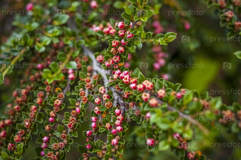 Кустарник с яркими мелкими цветками кизила. Крупный план с копией пространства на фоне природного ландшафта. Натуральные обои. Выборочный фокус