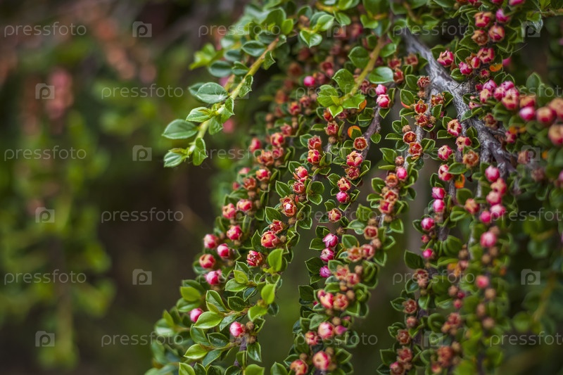 Кустарник с яркими мелкими цветками кизила. Крупный план с копией пространства на фоне природного ландшафта. Натуральные обои. Выборочный фокус