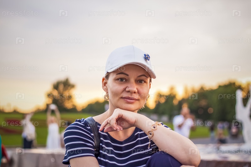 Портрет девушки в кепке на фоне городского пейзажа под открытым небом. Путешествовать. Образ жизни в городе. Центр, улицы