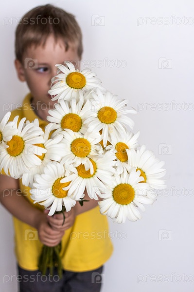 Милый мальчик с красивым букетом больших ромашек. Портрет ребенка, смешное и милое выражение лица. Выборочный фокус