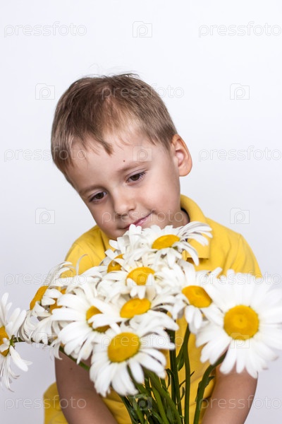Милый мальчик с красивым букетом больших ромашек. Портрет ребенка, смешное и милое выражение лица. Выборочный фокус