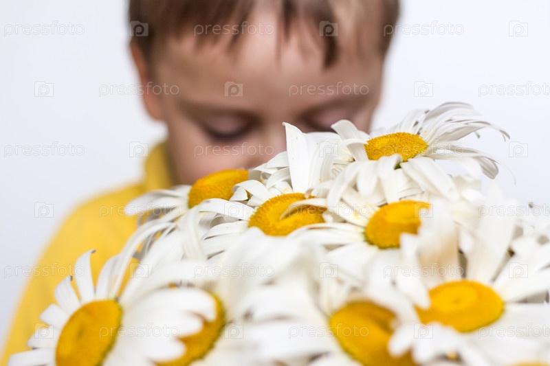 Милый мальчик с красивым букетом больших ромашек. Портрет ребенка, смешное и милое выражение лица. Выборочный фокус