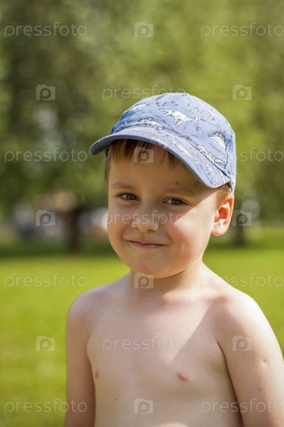 Симпатичный белокурый мальчик испытывает радость от прогулки летним днем у реки, сидя на сочной траве. Забавное выражение лица. летняя жара, ребенок без футболки