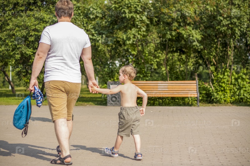 Прогулка в парке в летний день у реки и радость от прогулки. летняя жара, ребенок без футболки