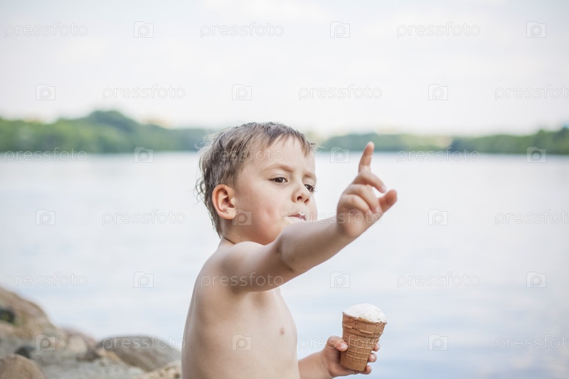 Симпатичный белокурый мальчик аппетитно ест мороженое летом, сидя на берегу реки. Охладитесь у воды. Забавное выражение лица