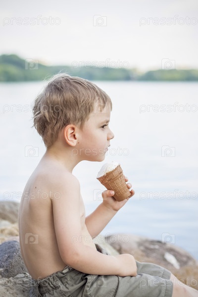 Симпатичный белокурый мальчик аппетитно ест мороженое летом, сидя на берегу реки. Охладитесь у воды. Забавное выражение лица