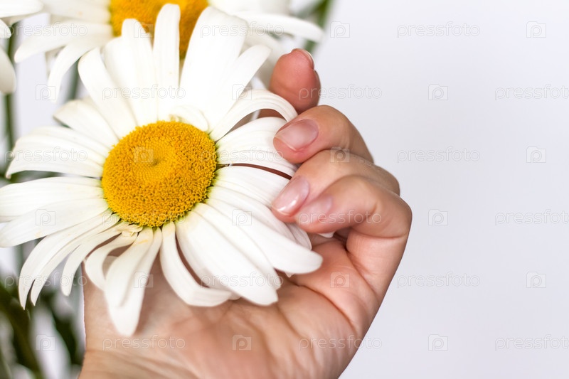 Женская рука касается ромашки. Средний план, выборочный снимок. Выборочный фокус. Индустрия красоты