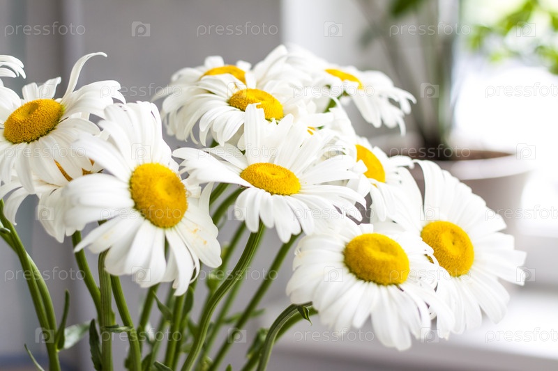 Букет больших ромашек в вазе на белом фоне. Средний план, выборочный снимок. Выборочный фокус