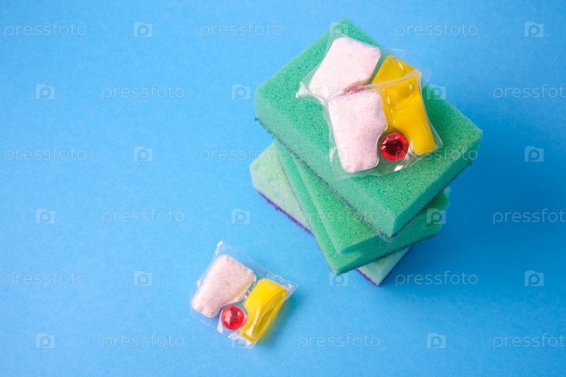 Гелевые капсулы для посудомоечных машин и губки на зеленом и желтом фоне мест копирования сверху, выбор между мытьем посуды руками или в посудомоечной машине
