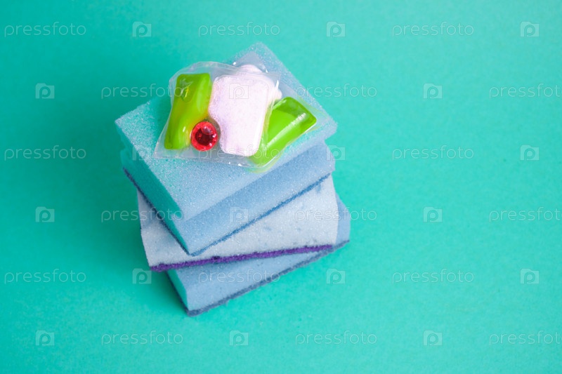 Гелевые капсулы для посудомоечных машин и губки на зеленом и желтом фоне мест копирования сверху, выбор между мытьем посуды руками или в посудомоечной машине