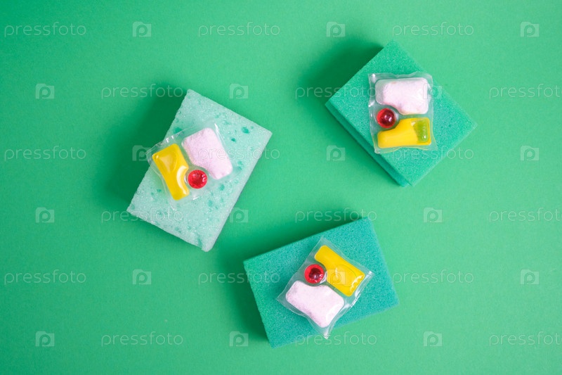 Гелевые капсулы для посудомоечных машин и губки на зеленом и желтом фоне мест копирования сверху, выбор между мытьем посуды руками или в посудомоечной машине