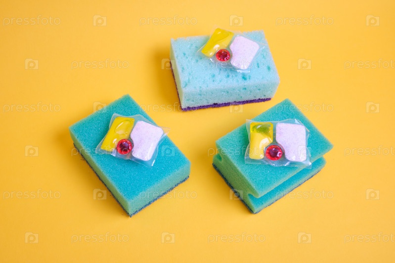Гелевые капсулы для посудомоечных машин и губки на зелено-желтом фоне мест копирования сверху, выбор между мытьем посуды руками или в посудомоечной машине