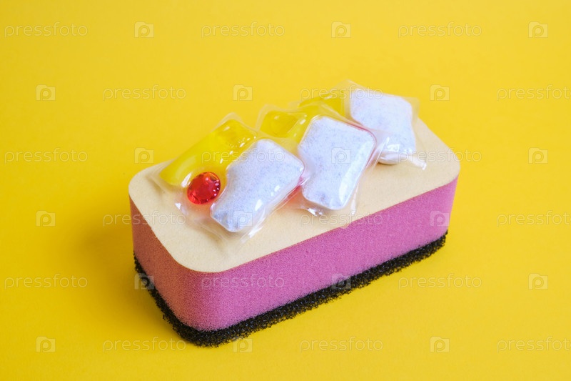 Гелевые капсулы для посудомоечных машин и губки на зеленом и желтом фоне мест копирования сверху, выбор между мытьем посуды руками или в посудомоечной машине