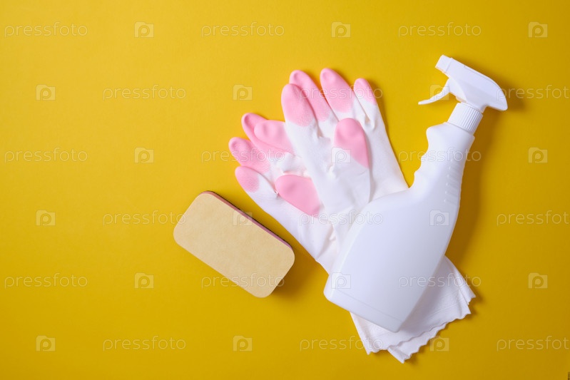 Набор чистящих средств на синем фоне. Плоская желтая тряпка и губка, резиновые перчатки, бутылка с чистящим средством, моющее средство. Уборка дома и концепция домашнего хозяйства