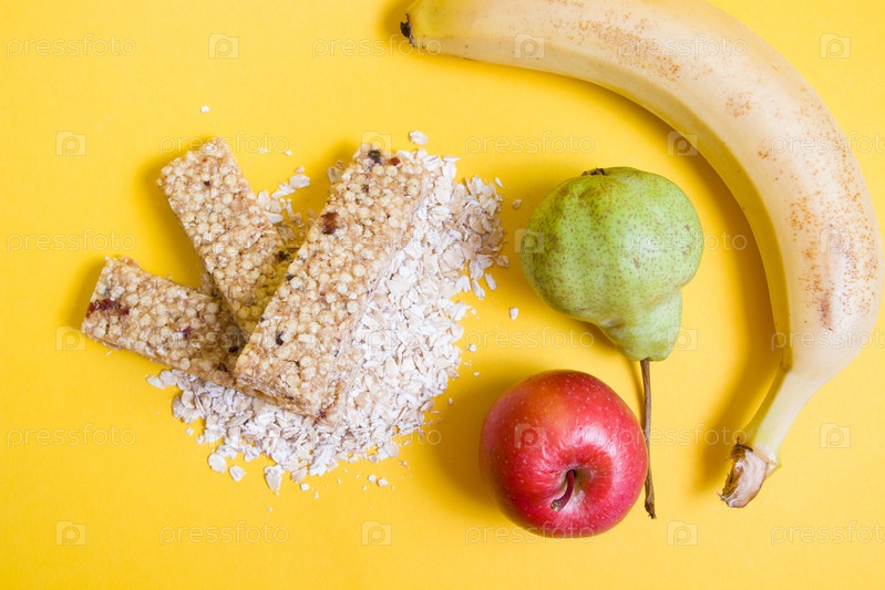 Мюсли и фруктовые батончики на куче сухой овсянки и различных фруктов на желтом фоне,