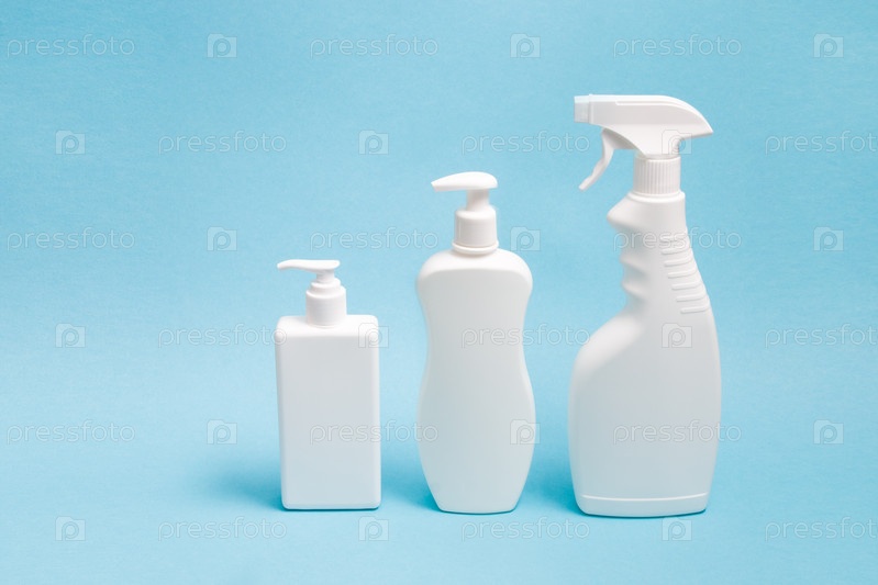 Несколько белых пластиковых бутылок с разными типами дозаторов на синем фоне, две белые небрендированные бутылки с дозатором и пульверизатор