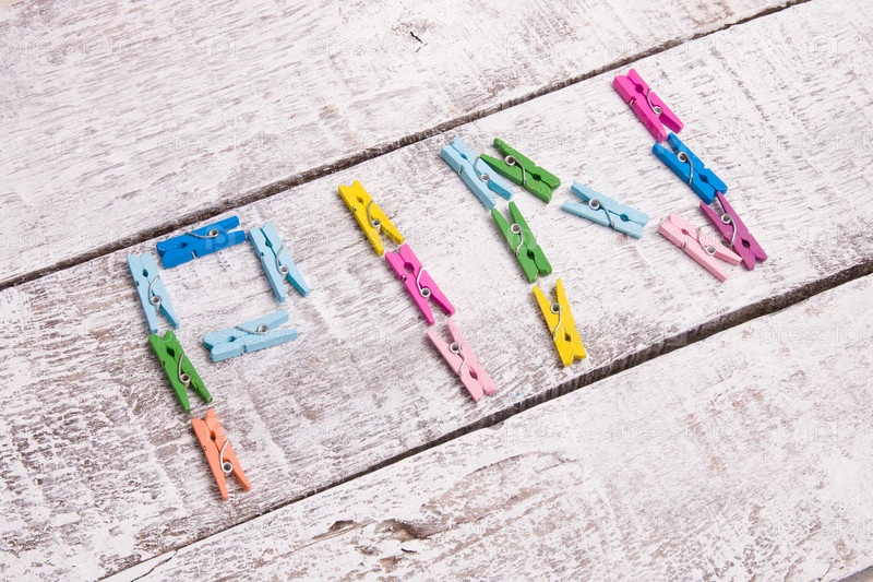 Маленькие прищепки для одежды на деревянном фоне слово булавка