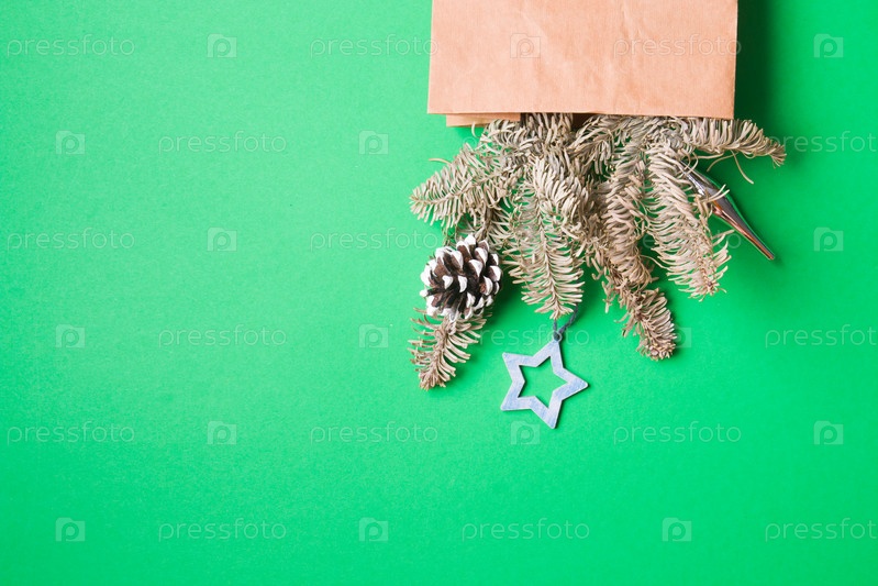 Букет, украшенный сосновыми шишками и елочными игрушками, пространство для копирования на зеленом фоне