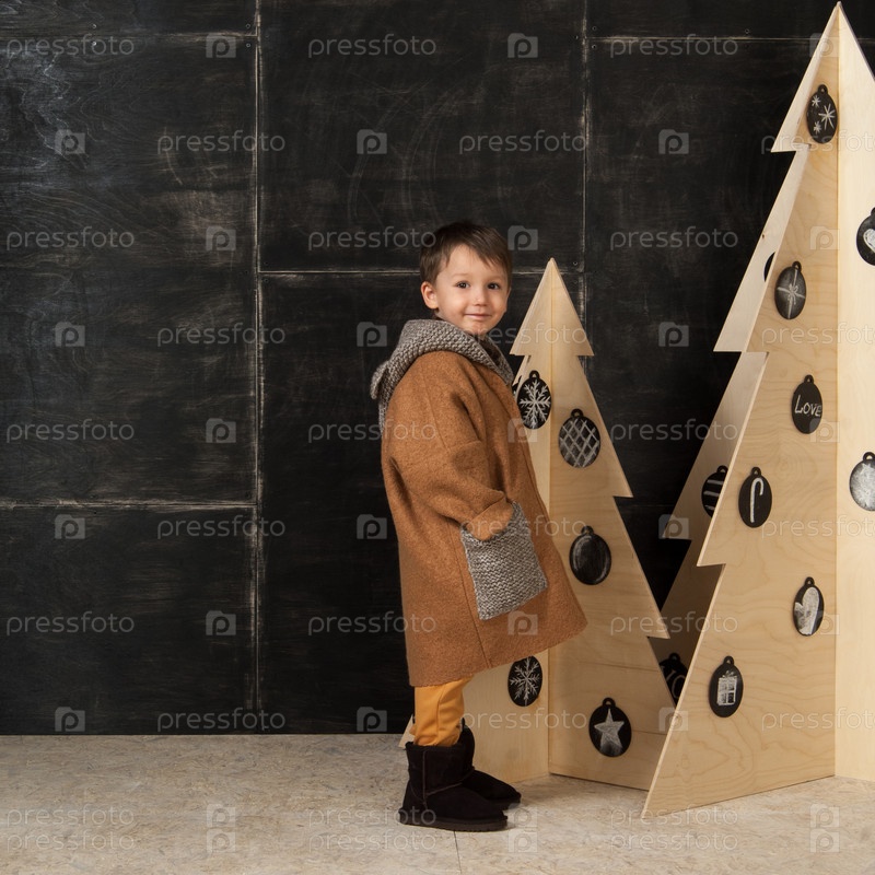 Маленький мальчик рядом с декоративными елками