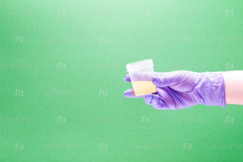 Рука в одноразовой медицинской перчатке держит банку для анализа с мочой, зеленый фон, пространство для копирования