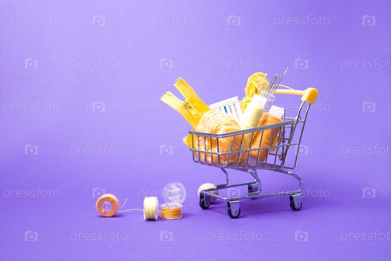 Тележка для покупок с различными аксессуарами и аксессуарами для шитья, желтые нитки разных оттенков, пространство для копирования фиолетового фона, концепция покупок для хобби